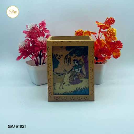 Artistic Wooden Pen Holder with Traditional Print - 9x9.5x14 cm