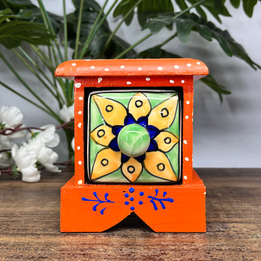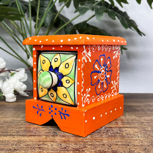 Decorative Orange Wooden Box with Hand-Painted Ceramic Drawer – Home Décor