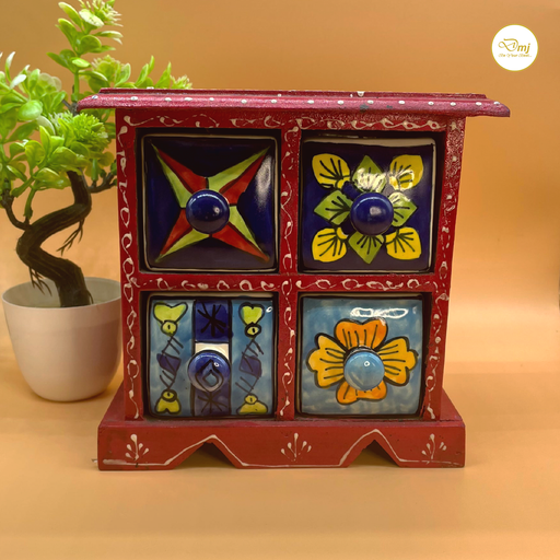 Handcrafted Wooden Box with 4 Ceramic Drawers – Colorful Decorative Storage Organizer
