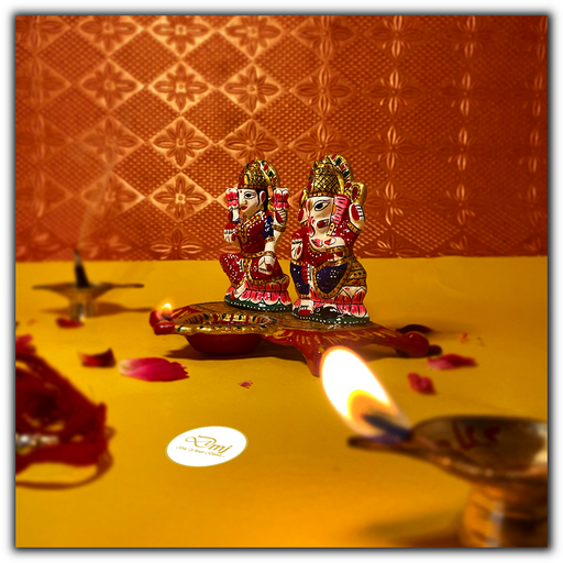 - Metal Laxmi Ganesha Saraswati Diya on Leaf Chowki (1)