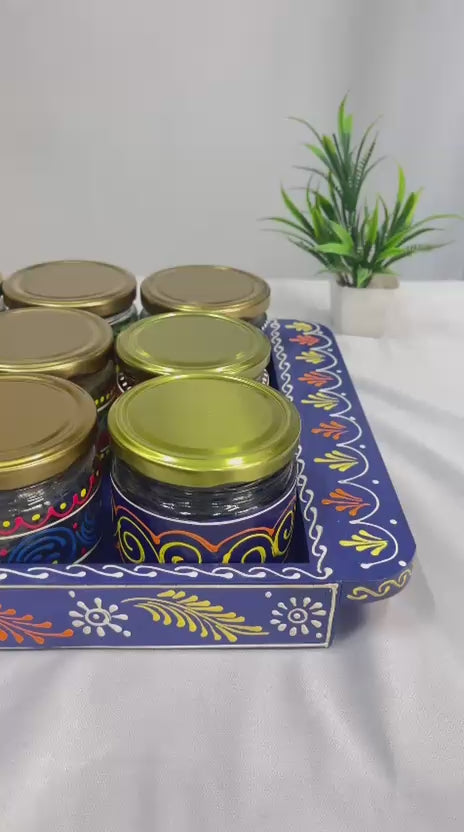 Hand-Painted 9 Jar Set with Blue Wooden Tray – Indian Decorative Gift & Storage Set