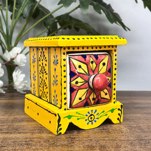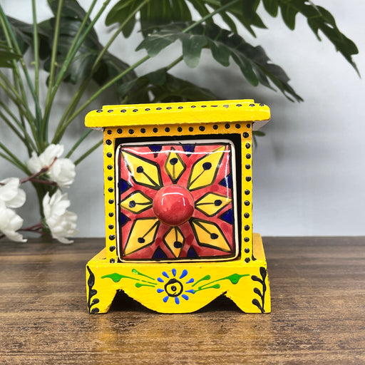 Vibrant Yellow Handmade Wooden and Ceramic Drawer Box – Ethnic Boho Style Organizer, Perfect for Colorful Home Décor.
