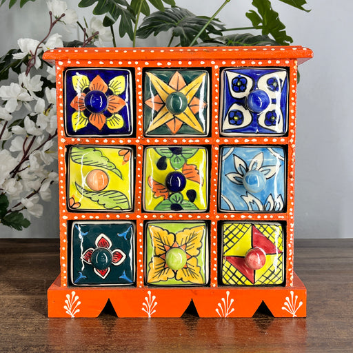 Hand-Painted Floral & Ethnic Ceramic Drawer Set in Vibrant Orange Wooden Frame