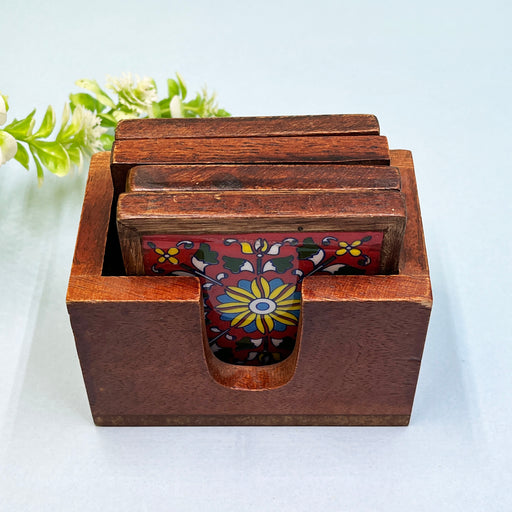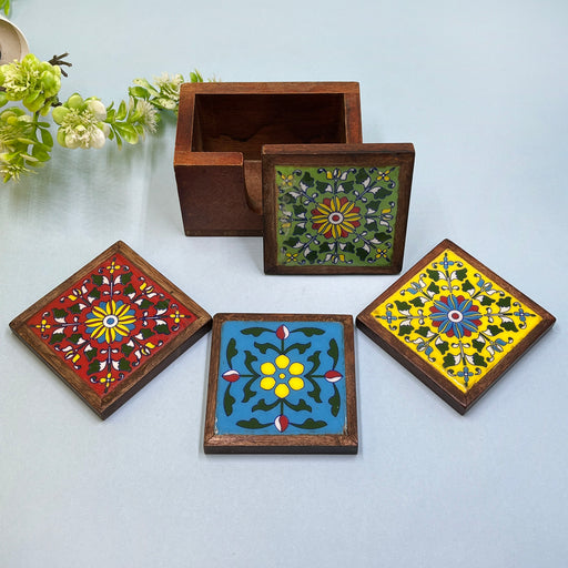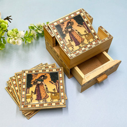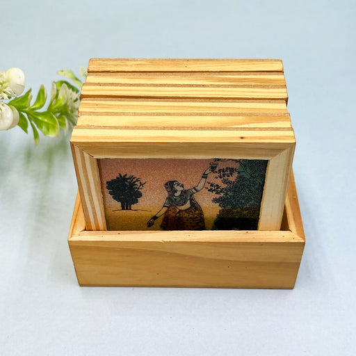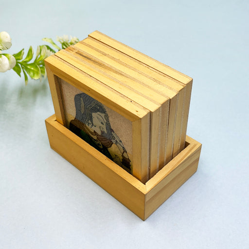 Handcrafted Wooden Coaster Set with Traditional Art Print