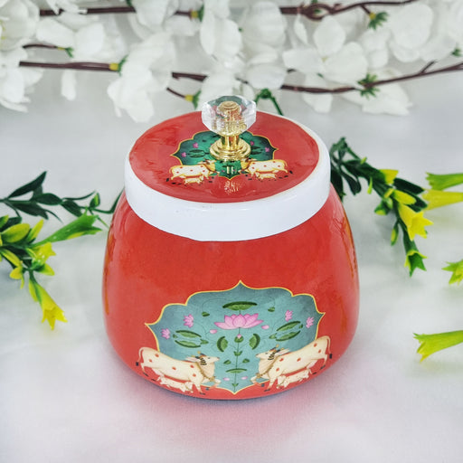 Red Color Cow & Calf Design Pichwai Art Metal Dry Fruits Jar