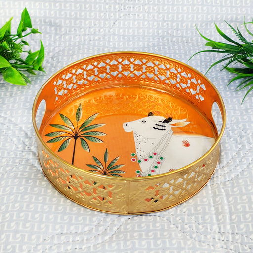 Pichwai Art Metal Tray with Cow Design – Lightweight