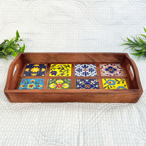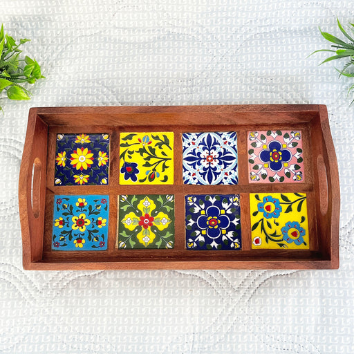 Handcrafted Wooden Serving Tray with Multicolor Fitted Ceramic Tiles