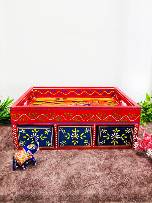 Diwam HandicraftsEn stockBring home a blend of art and utility with this hand-painted wooden drawer chest featuring a unique tray-style top. Decorated with vibrant red, blu...